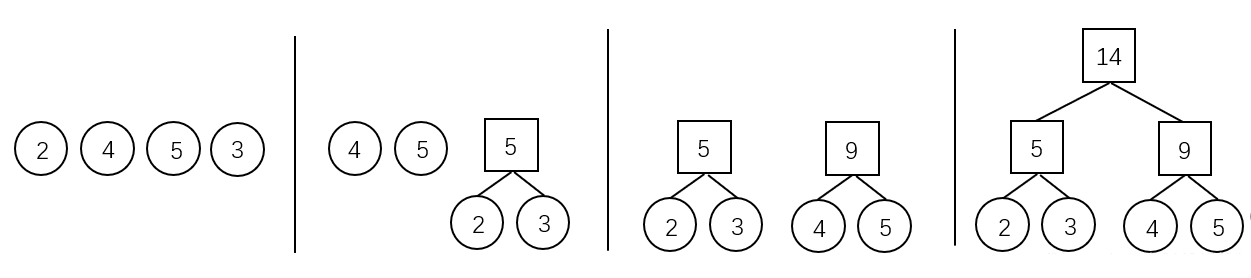 中。 - 重复 2、3 步,当集合中只剩下一棵二叉树时,这棵二叉树就是霍夫曼树。