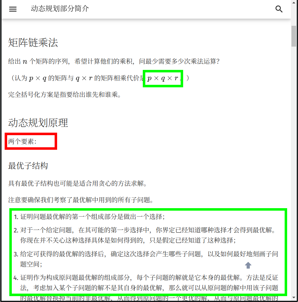 注意我们描述 乘法 的时侯一般使用 \times 或者 \cdot,特殊情况(如卷积)下会使用 *(也可以写成 \ast)。标题是简洁的词组,但我们不希望正文部分由词组拼凑而成。上图中「两个要素」,建议更改为「动态规划的原理具有以下两个要素」,上下文保持连贯。可取的地方是,适当使用 有序 列表可以更有条理地表述内容。再次提醒,在使用列表的时侯,每一项如果是一句话,需要在末位添加 标点符号。有序列表通常添加分号,在最后一项末位添加句号;无序列表统一添加句号。