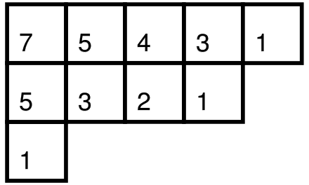杨图(Young diagram,使用点表示时又称 Ferrers 图,在 分拆数 一节中有相关介绍)是一个有限的框或单元格集合,左对齐排列,行长按非递增顺序排列。如果把杨图每行的方格数列出,我们得到了一个非负整数