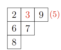 同理,若满足同一列中的数字严格递增,且同一行中的数字单调递增,则该斜杨表被称作 半标准斜杨表;若半标准斜杨表满足各方格不重复的填入数字