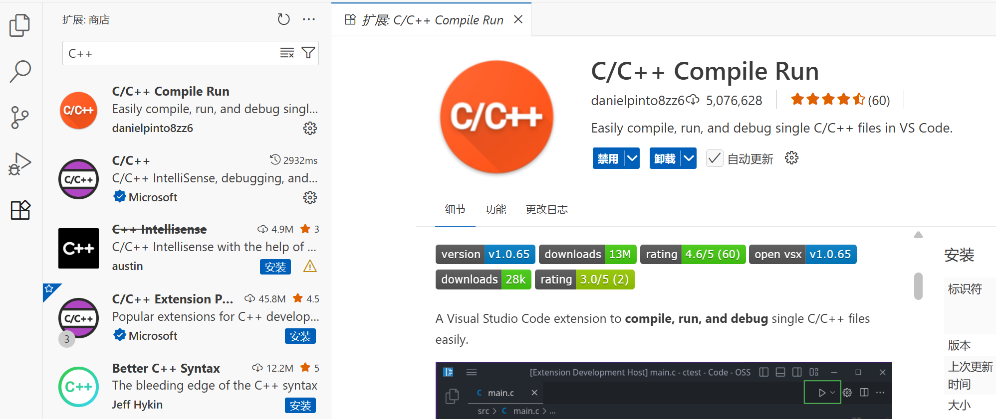 在 VS Code 中打开扩展商店,在搜索栏中输入 C++ 或者 @category:"programming languages",然后找到 C/C++,点击 Install 安装扩展.